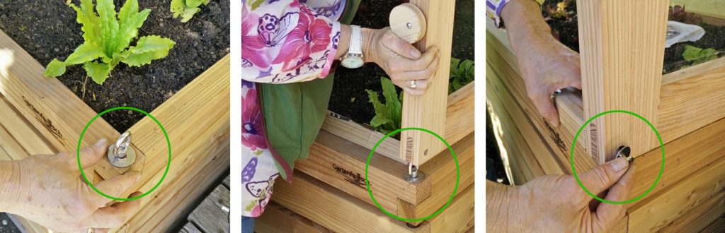 Eine besondere Bedeutung kommt dem letzten Element, dem Beetabschluss zu. Es handelt sich um so genannte Ringaugenmuttern. Sie dienen in besonderem Maße dem späteren Befestigen eines Treibhauses als Hochbeet Aufsatz, oder als nützliches Befestigungselement für Rankhilfen oder sonstige Stützen. Die Aufsätze sind so gefertigt, dass diese Ringaugenmutter beim Aufsetzen als Ringanker unsichtbar in einer Fräsung verschwindet. Durch das Versplinten mit einer von Hand eindrehbaren Edelstahl Schraube wird der Aufsatz mit dem Pflanzbeet solide verbunden.