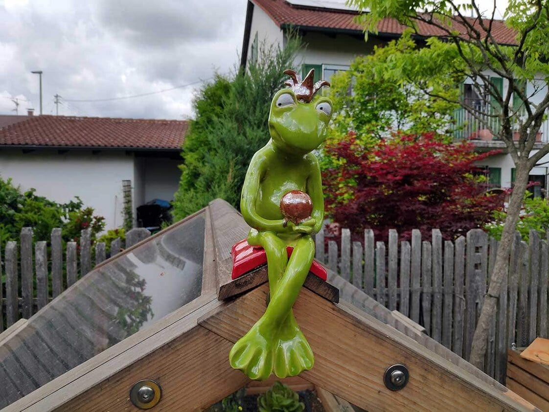 Froschfigur für den First. Da sitzt er und schaut. Grün im Gesicht, mit einem goldenen Bällchen auf dem Schoß und Bauchnabel. Als ob er ein Säuger wäre…. 🙂