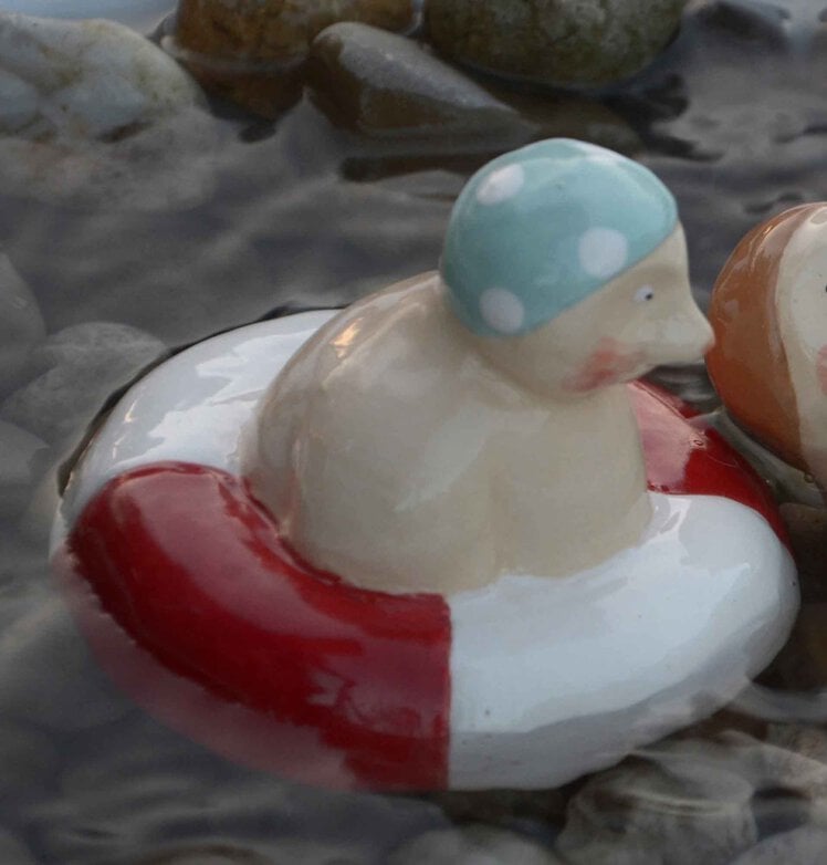 Sie liegt gerne schwimmend in Terrassenteichen oder Wasserbecken, er hingegen ist Nichtschwimmer und über ihre Schwimmleidenschaft wenig amüsiert.