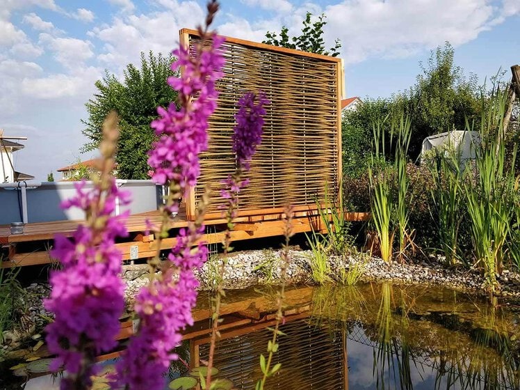 Weide, Lärche und Edelstahl ergänzen sich in diesem Rahmen zu einem Ganzen. Flechtwerk bildet einen festen Flechtkörper in dreidimensionaler Tiefe. Es schützt vor Blicken ohne auszusperren, grenzt ab, aber nicht aus!