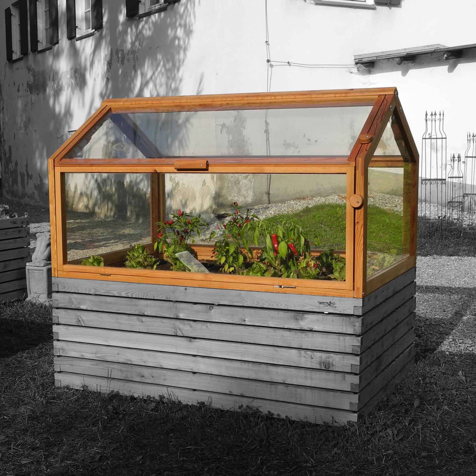 Die Holzkonstruktion besteht aus dem widerstandsfähigen Holz der heimischen Lärche, verglast ist das Treibhaus mit Acrylglas, auch als Markenname Plexiglas bekannt, da es dauerhaft transparent bleibt und nicht vergilbt.