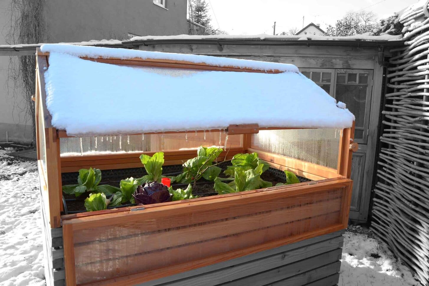 Die Holzkonstruktion besteht aus dem widerstandsfähigen Holz der heimischen Lärche, verglast ist das Treibhaus mit Acrylglas, auch als Markenname Plexiglas bekannt, da es dauerhaft transparent bleibt und nicht vergilbt. (Verweis zu Acrylglas)