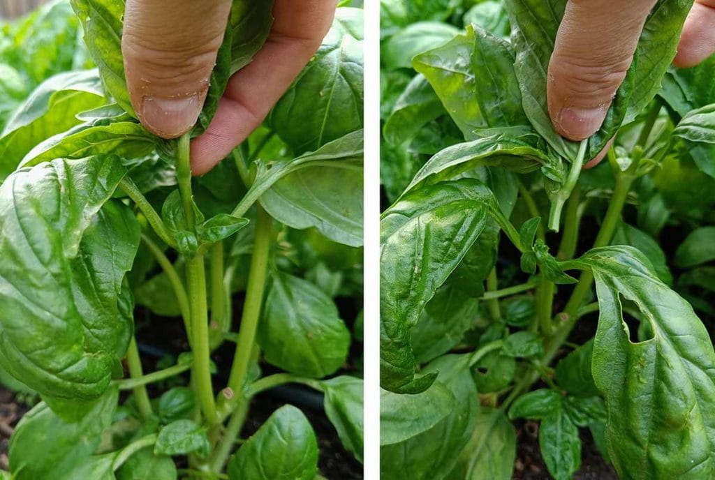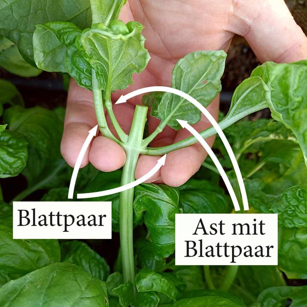 - Die Pflanze bildet vor allem Blattpaare, zwischen denen neue Triebe entstehen. Fördern Sie diese Seitentriebe und ernten Sie den Mitteltrieb.