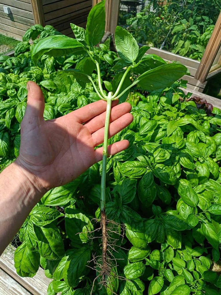 Basilikum kann unfassbar ertragreich kultiviert werden. Dabei muss man jedoch verstehen, dass jeder Halm im gekauften Basilikumtopf eine eigene Pflanze ist. Diese Töpfe sind oft dicht besät. Die Pflanzen stehen in diesen Behältnissen in extremen Bedingungen, sie behindern sich gegenseitig und können sich nicht entwickeln.